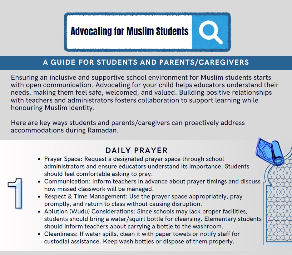 - Request accommodations — prayer spaces, quiet areas during lunch, adjusted PE activities
